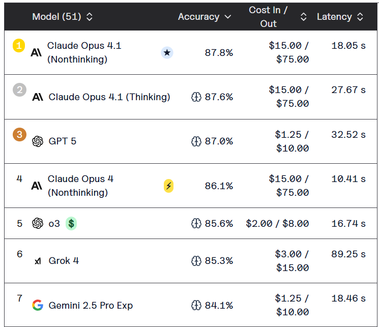 Claude Opus 4.1 ranks at the very top - right next to GPT-5 and Gemini 2.5.