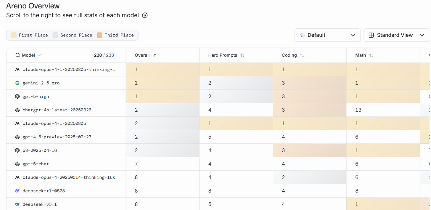 In the Arena Overview, it ranks first overall with 1,447 points, alongside GPT-5 and Gemini 2.5.
