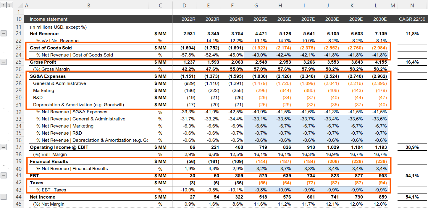 Most cost lines are usually projected as a percentage of net revenue. But the exact percentages - and how they change over time - should reflect your investment thesis.