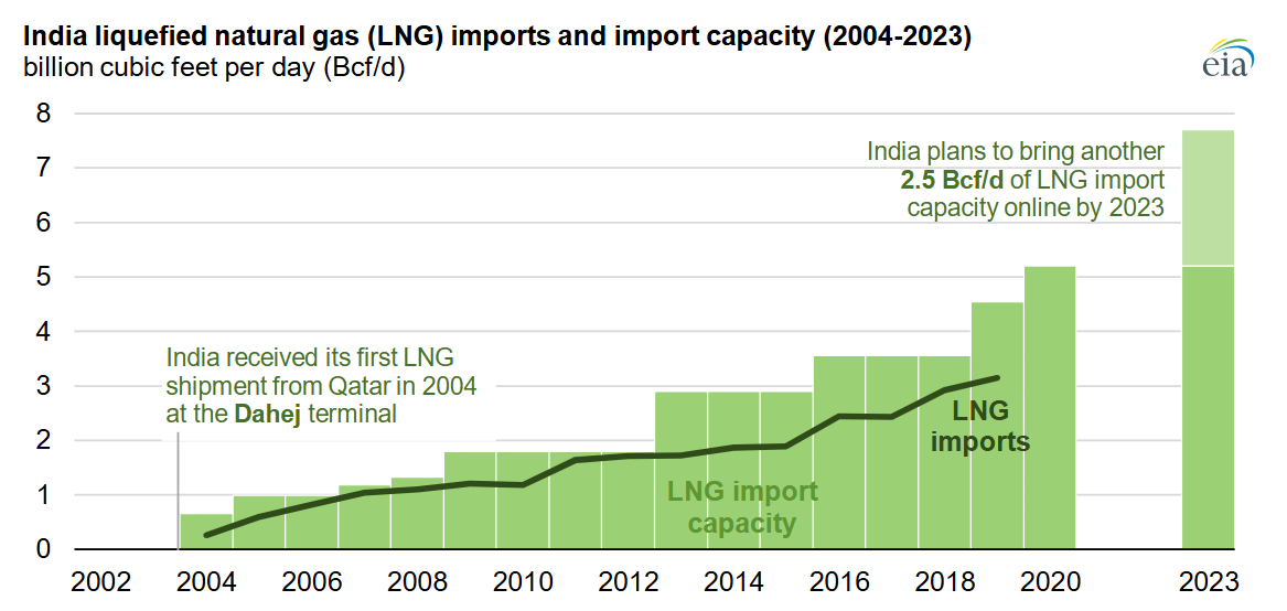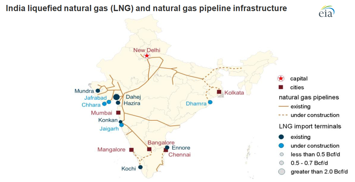 India’s national gas infrastructure masterplan targets increasing gas’s share of the primary energy mix from roughly 6% today to 15% by 2030 (most of it coming from Qatar) - which would require a tripling of import capacity.